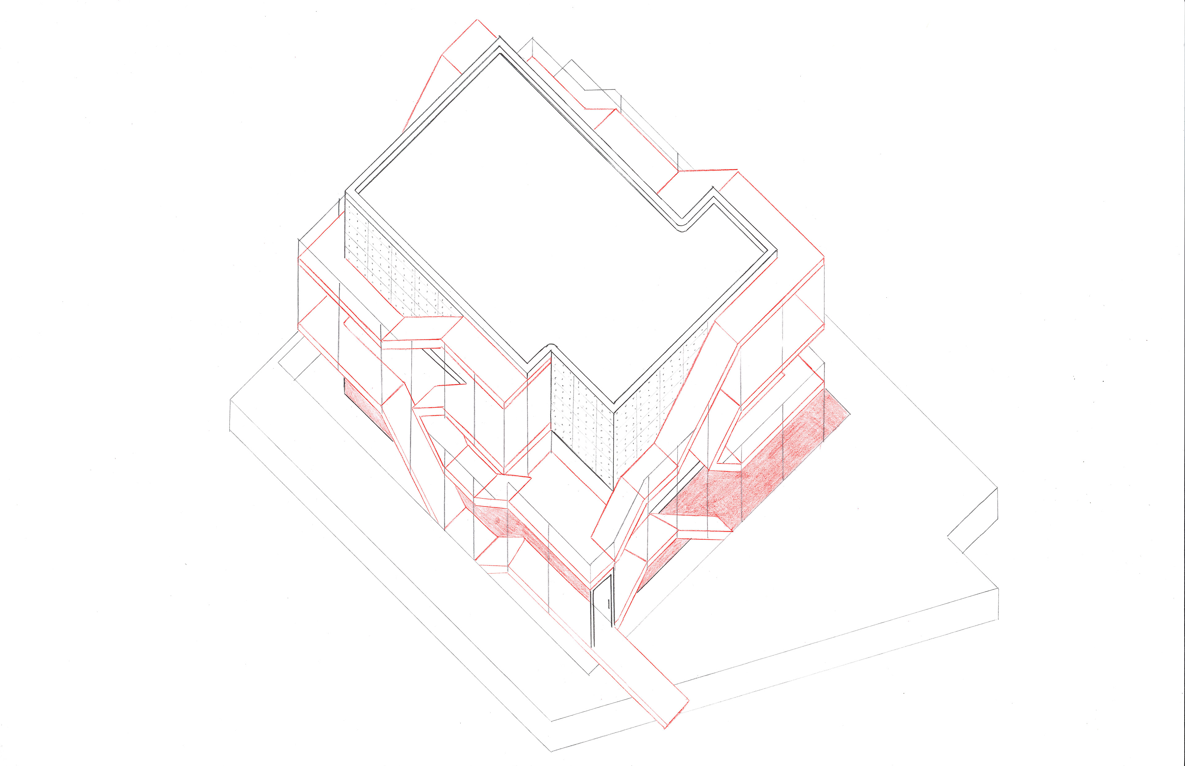 Red Plus Program: The plus program can be defined as a communal library/ office space where the professors and students can collaborate in an academic setting sunken into the ground creating a cozy and sheltered environment.