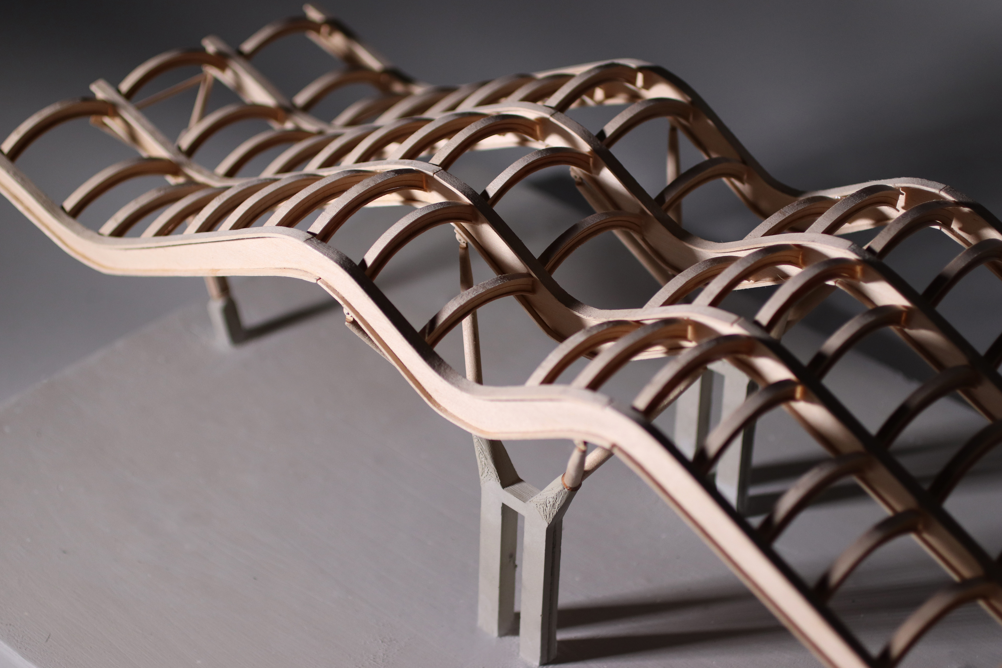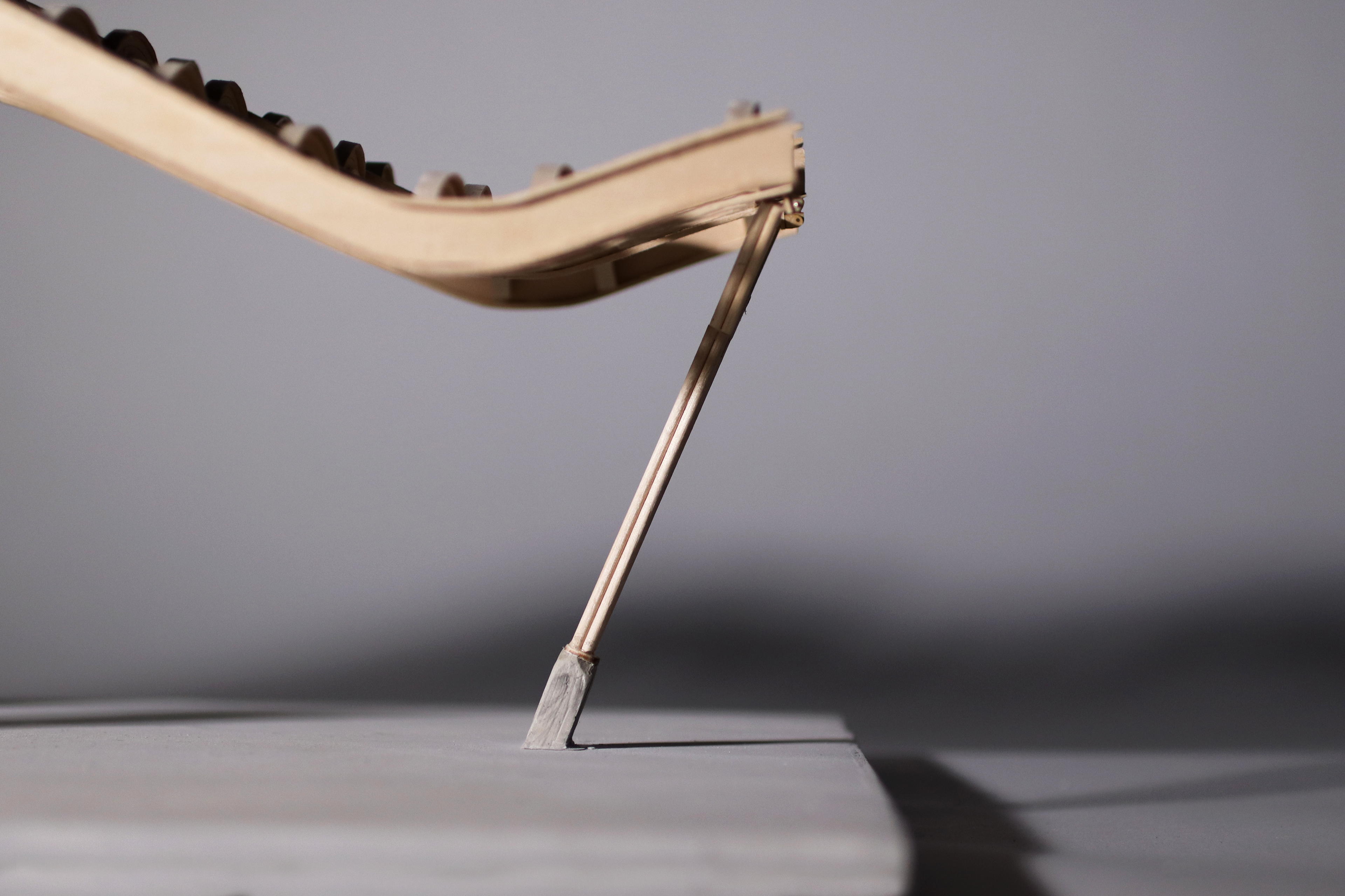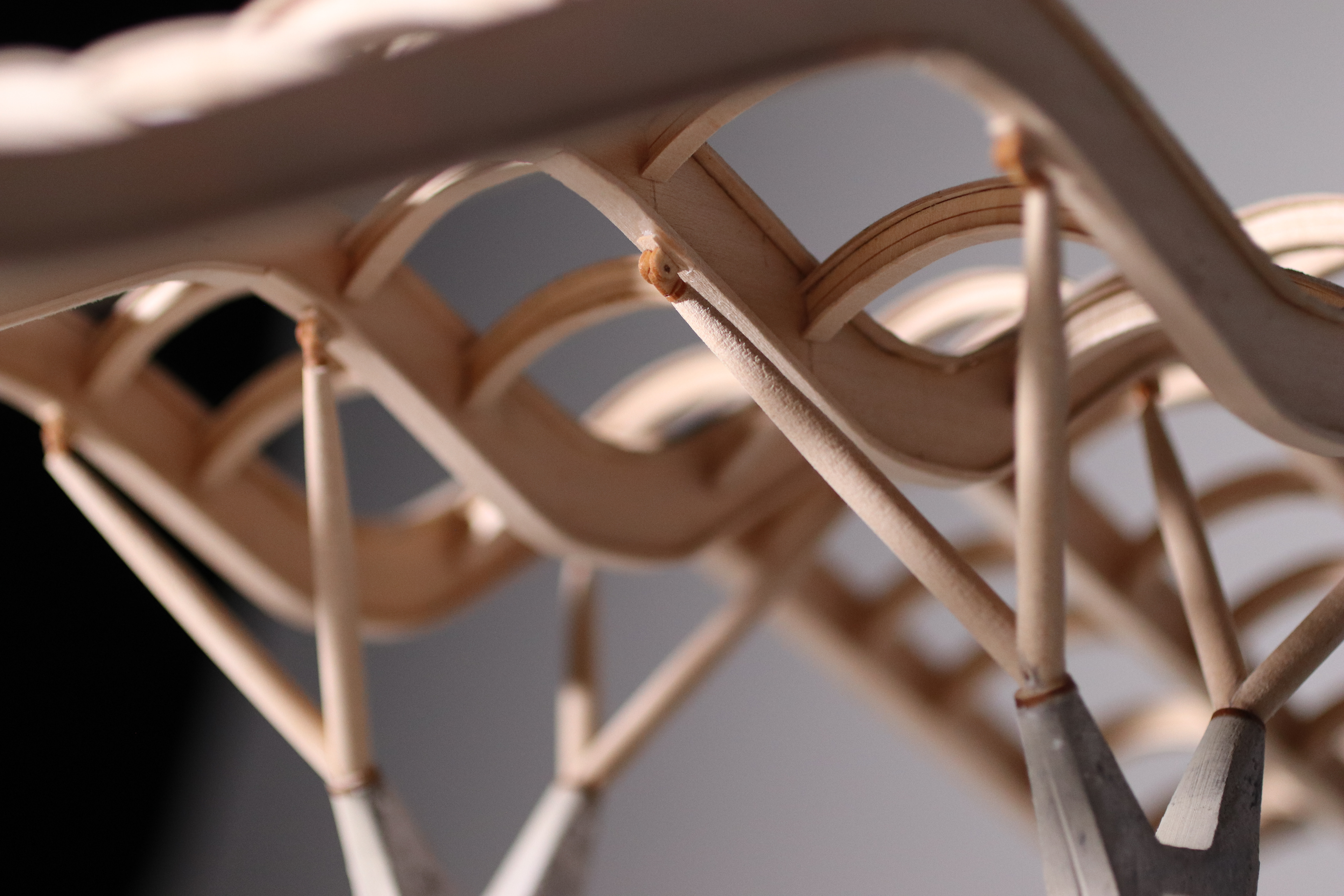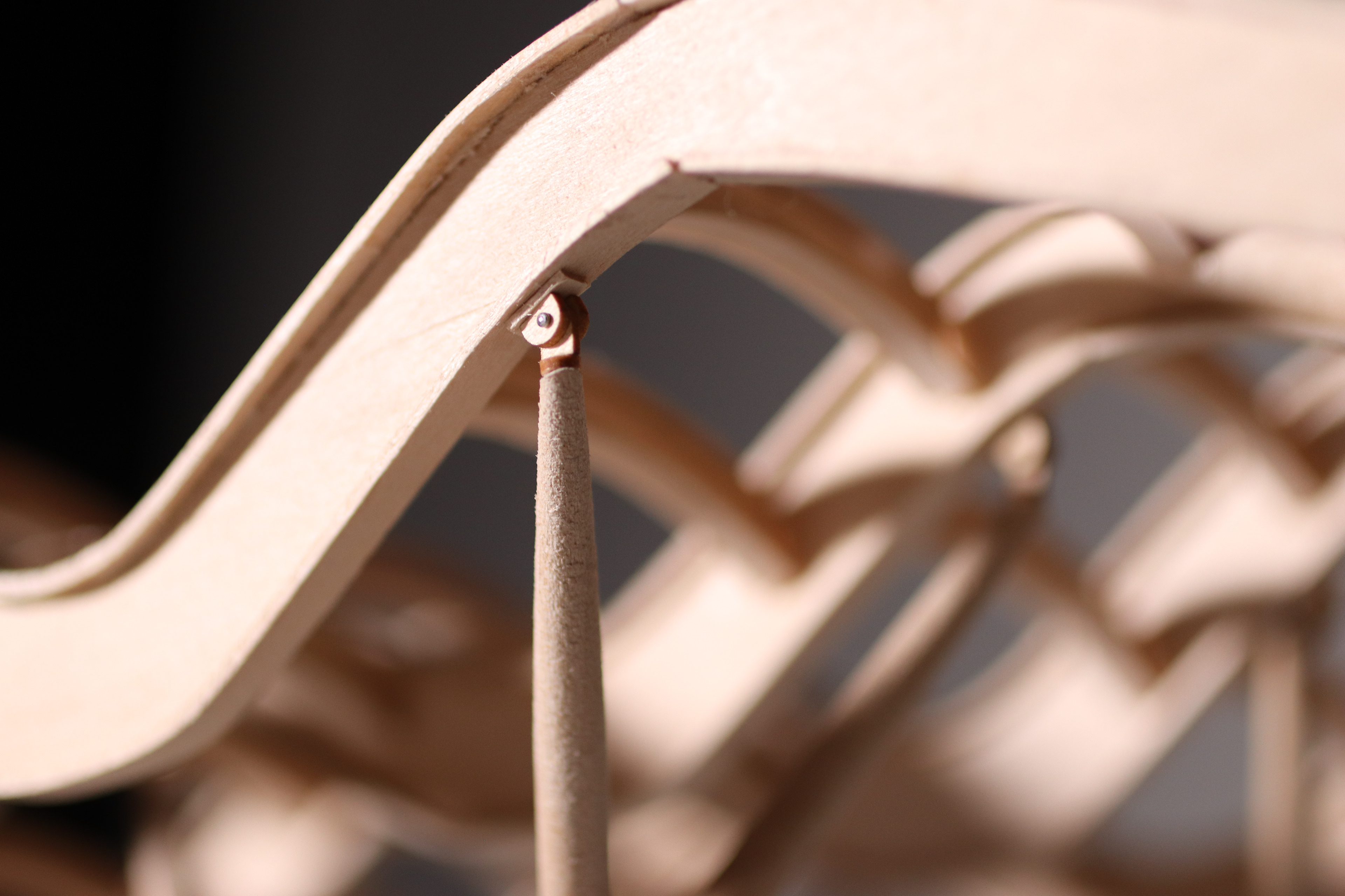 The roof system was constructed using basswood planks that are both laser and hand cut. The vertical strips for the I-Beams are laser cut to achieve the accurate curvatures of the beam, whereas the horizontal strips are cut and then soaked in order allow a more bendables material. After the strips are thoroughly soaked, we molded the strips to the vertical beam by taping them at various points. For the arches, we used a similar fomat of bending and laser cutting, this time without soaking the horizontal strips. In order to make sure the pieces were assembled seamlessly, we glued the arches across the curved beams before attaching them to the H support.