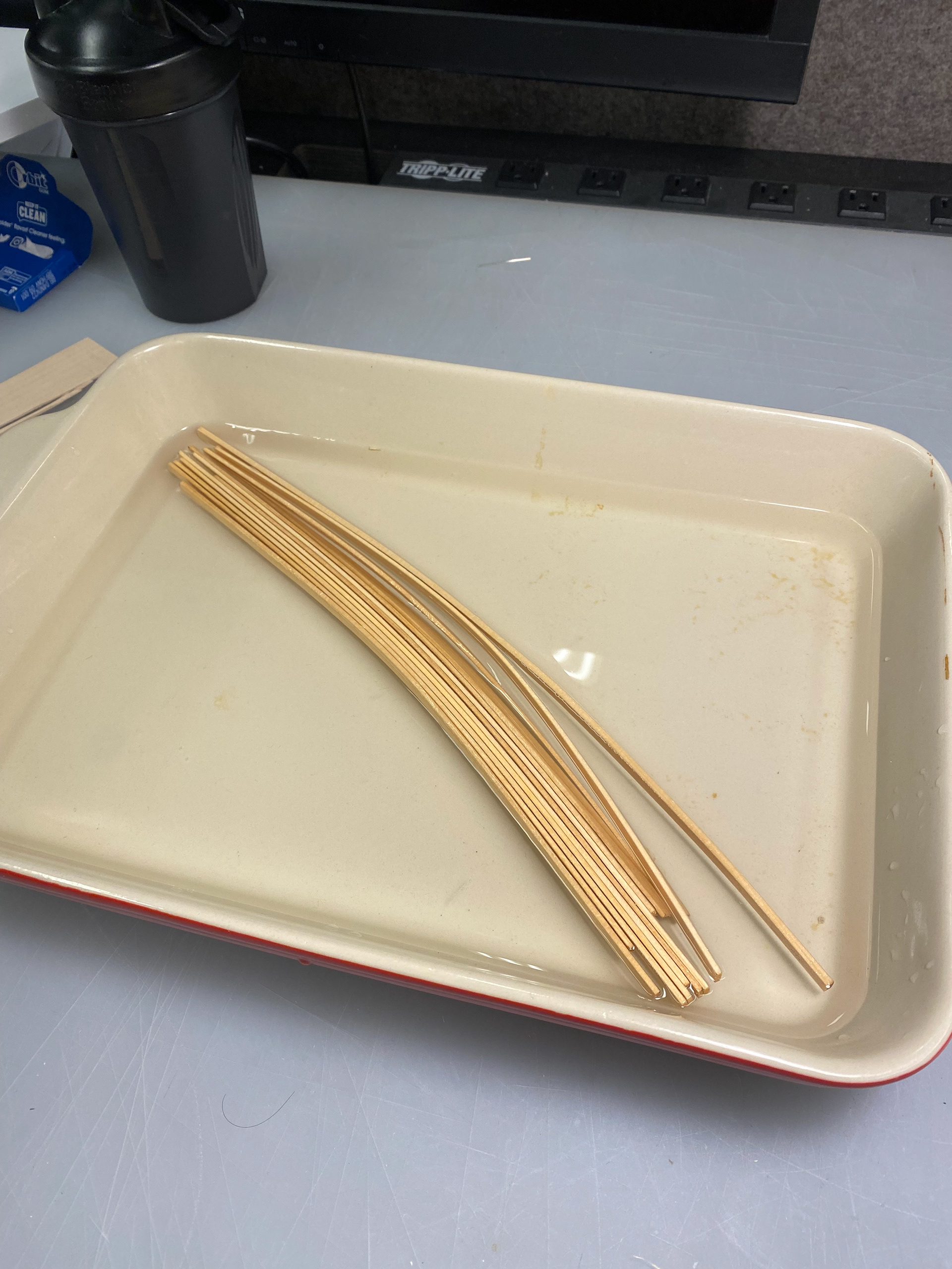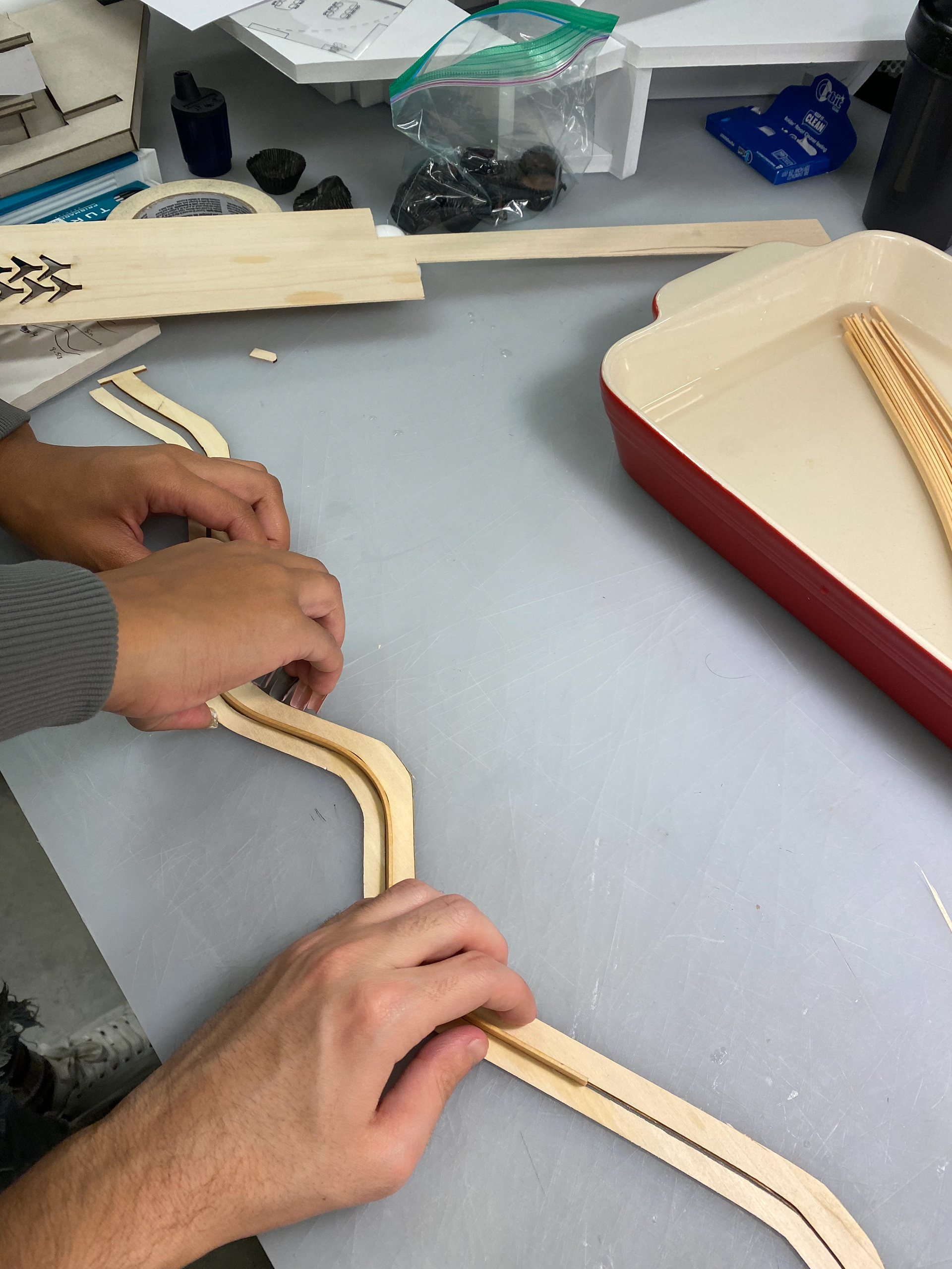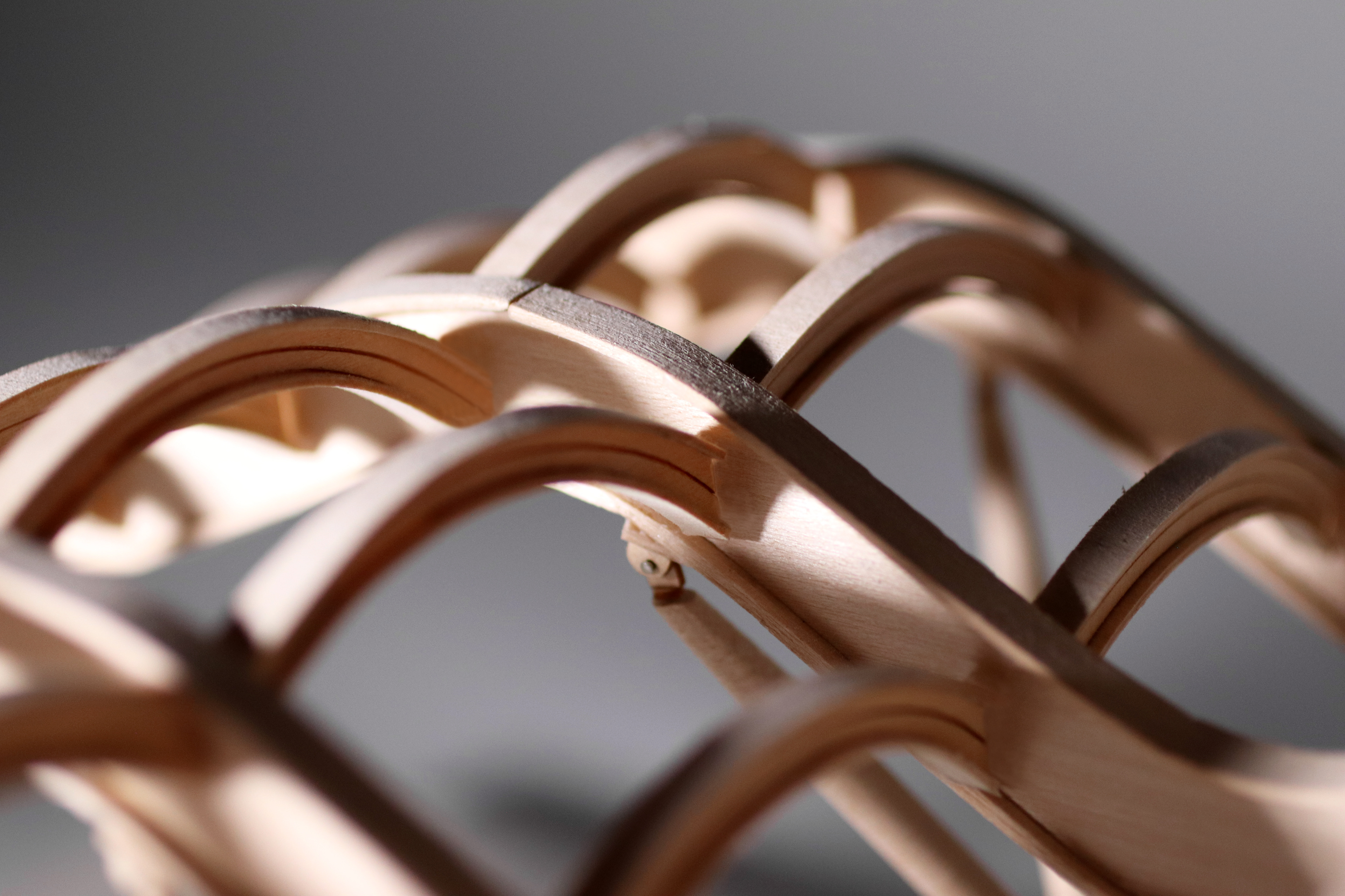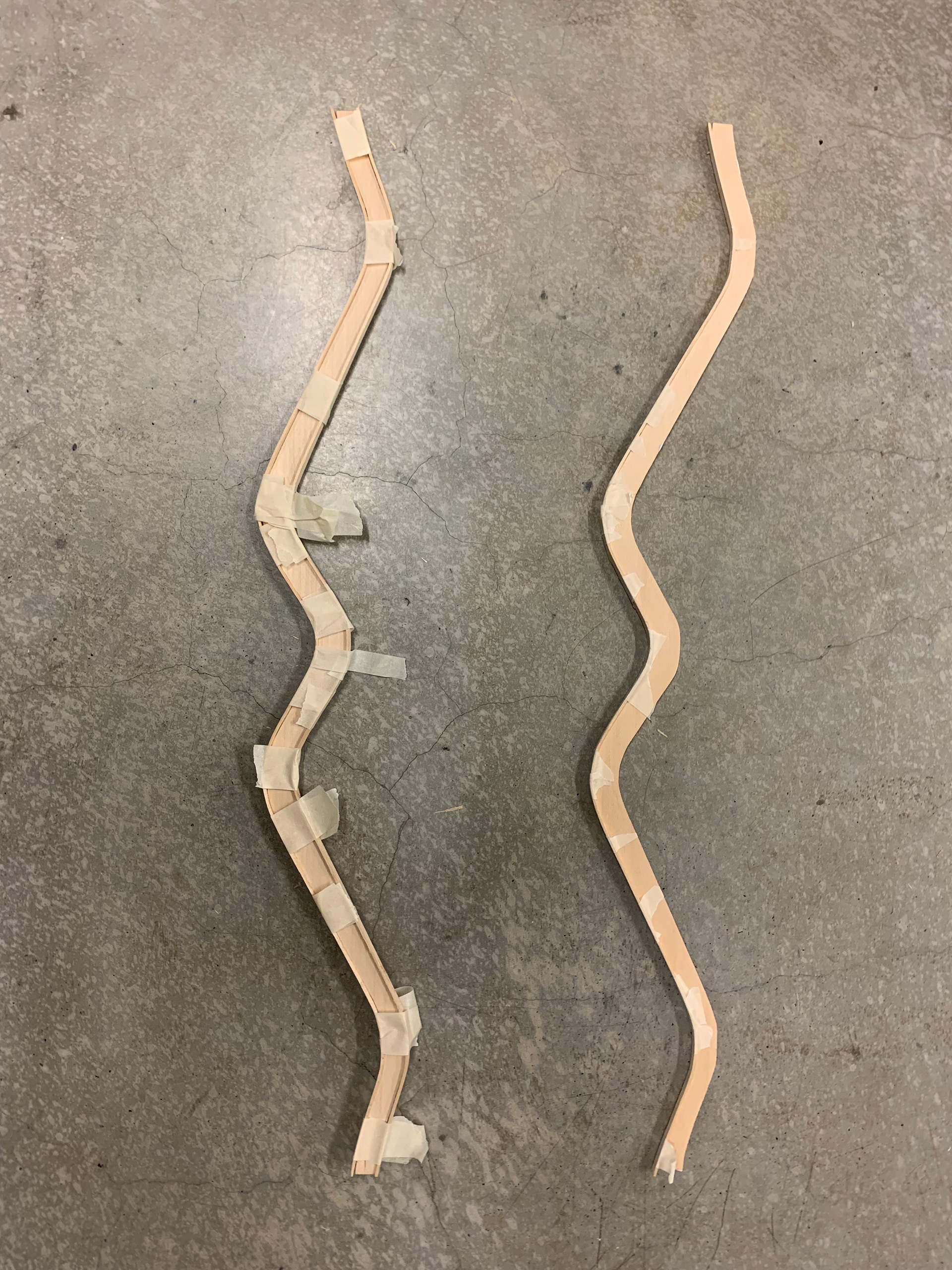 The roof system was constructed using basswood planks that are both laser and hand cut. The vertical strips for the I-Beams are laser cut to achieve the accurate curvatures of the beam, whereas the horizontal strips are cut and then soaked in order allow a more bendables material. After the strips are thoroughly soaked, we molded the strips to the vertical beam by taping them at various points. For the arches, we used a similar fomat of bending and laser cutting, this time without soaking the horizontal strips. In order to make sure the pieces were assembled seamlessly, we glued the arches across the curved beams before attaching them to the H support.