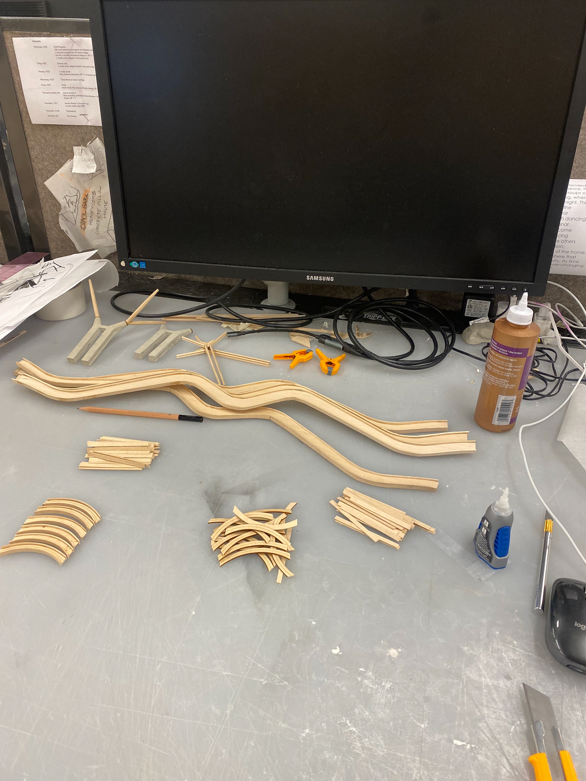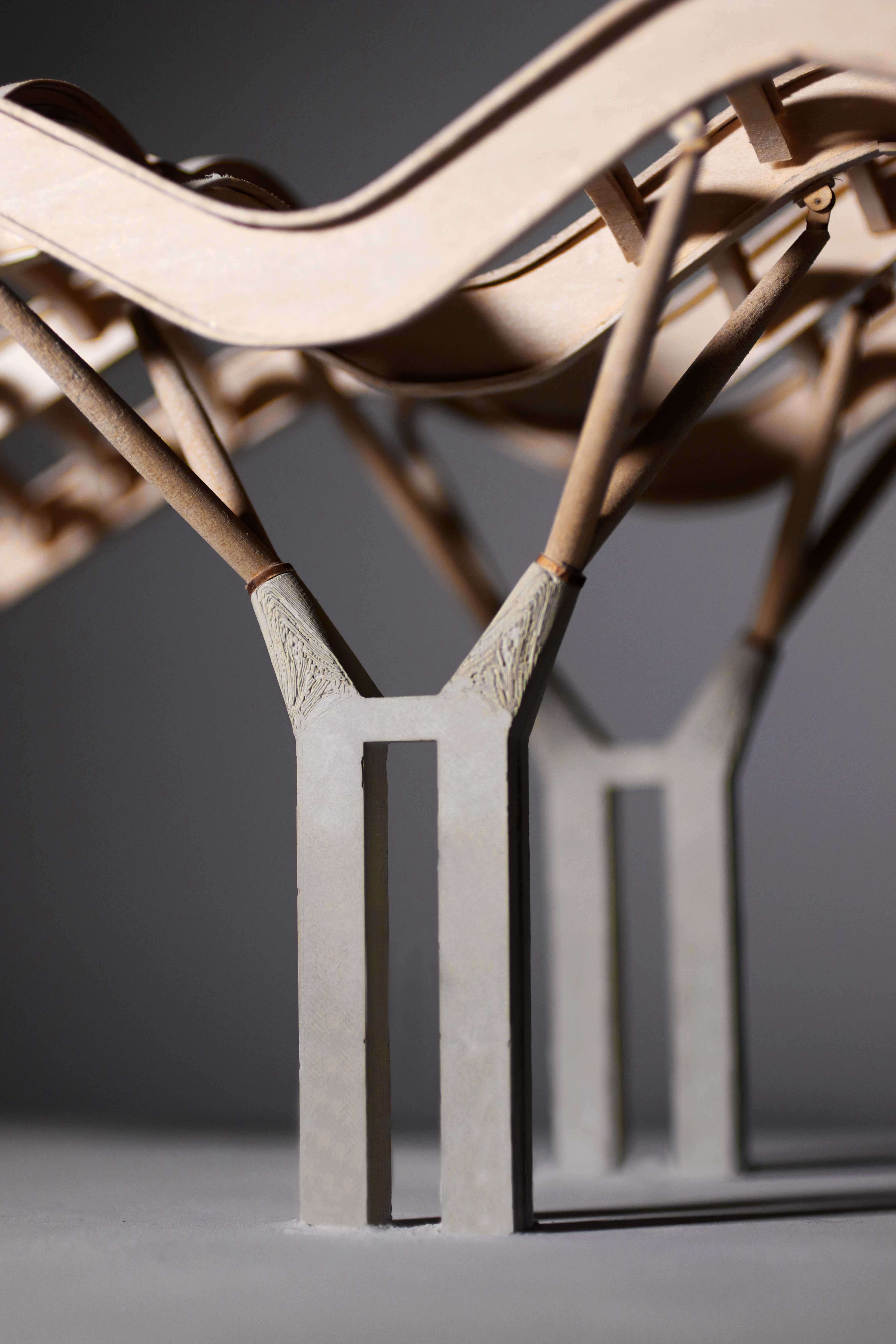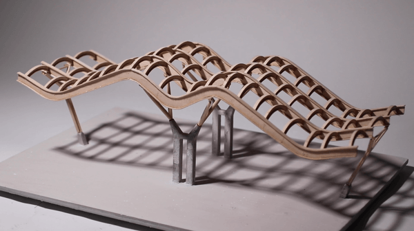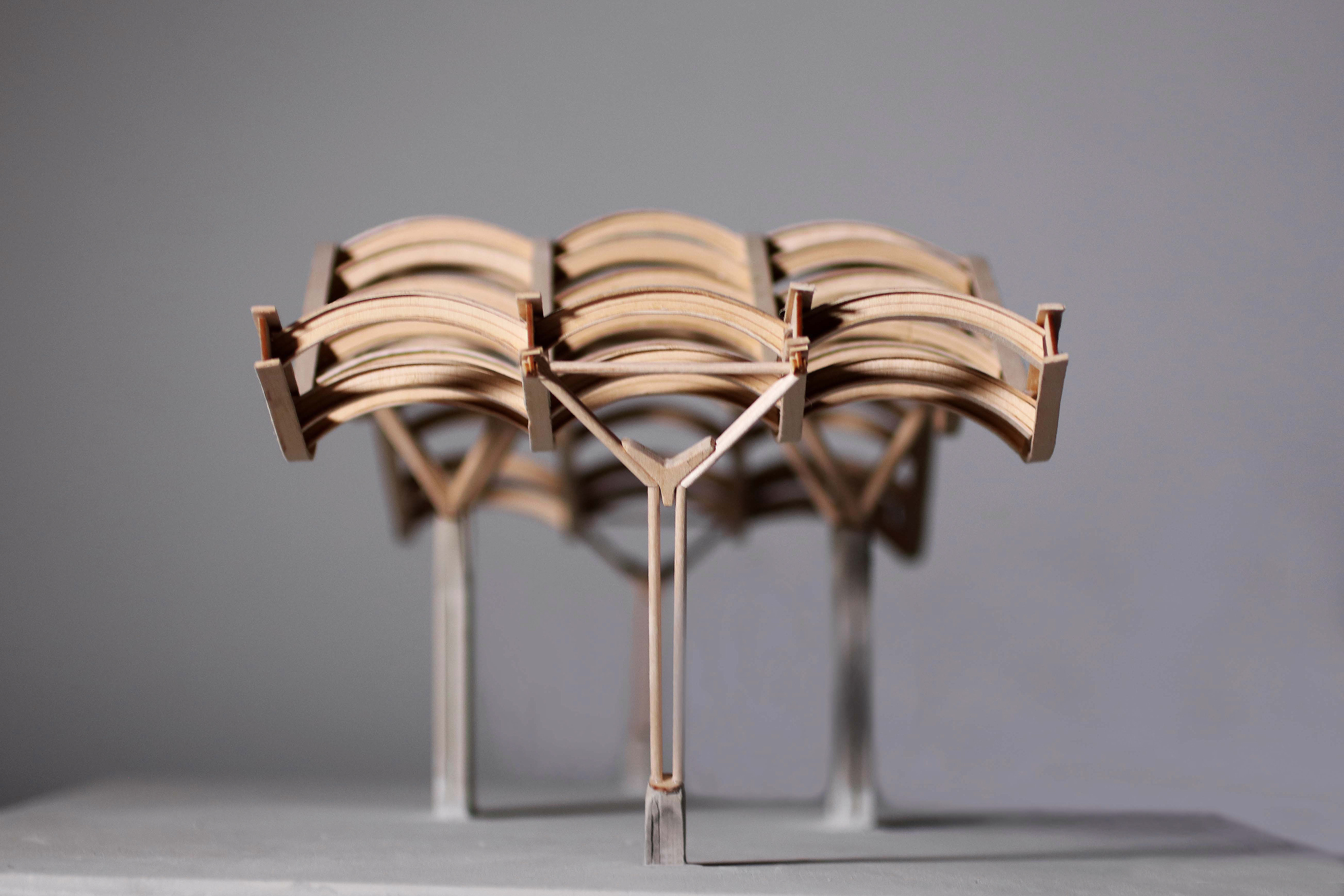 After understanding the tectonics of the building we came to the conclusion that in order for the structural integrity of the model to be stable, we are going to have to adjust very minute aspects of the column length and placement. We also decided to use basswood instead of chipboard for the curved i-beams and the arches inbetween all of the beams. To achieve the accurate curvature, we laser cut the vertical piece and soaked the horizontal pieces so that it curves onto the vertical piece. Although in real life there is a pinned connection between the column and the undulating beam, we are going to extend the column into a slot that we created in the beam in order to withstand the load of the modeled roof. We then fabricated the diagonal columns with the tapered ends to see how it would look. This was all done in scale of what the actual model will be (1:10).