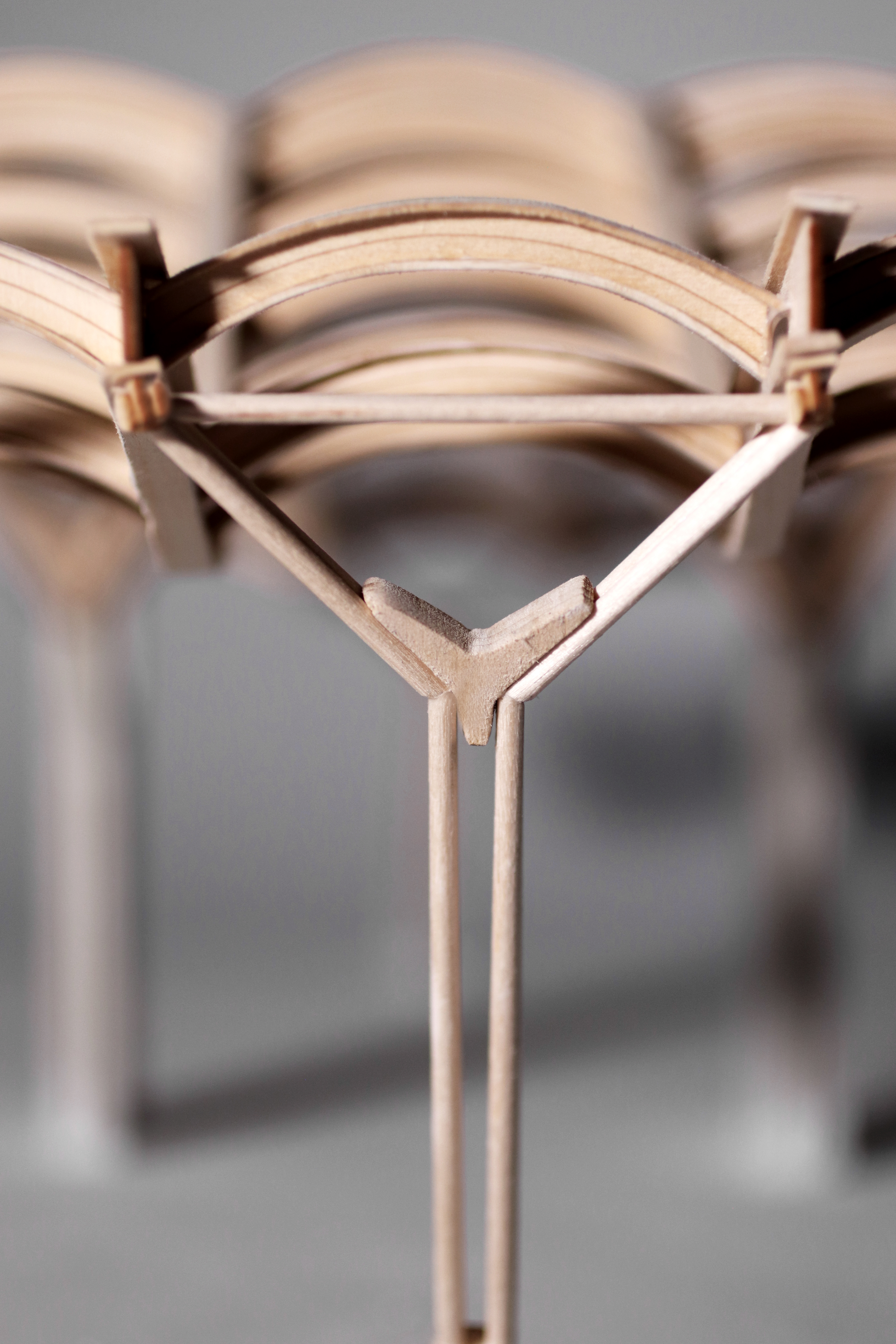 The Y-Supports consisted of 1/8 inch wooden dowels that were doubled and cut at an angle to provide the accurate degree in order to fit on the roof system. The center piece was laser cut and sanded to create another tapered effect.