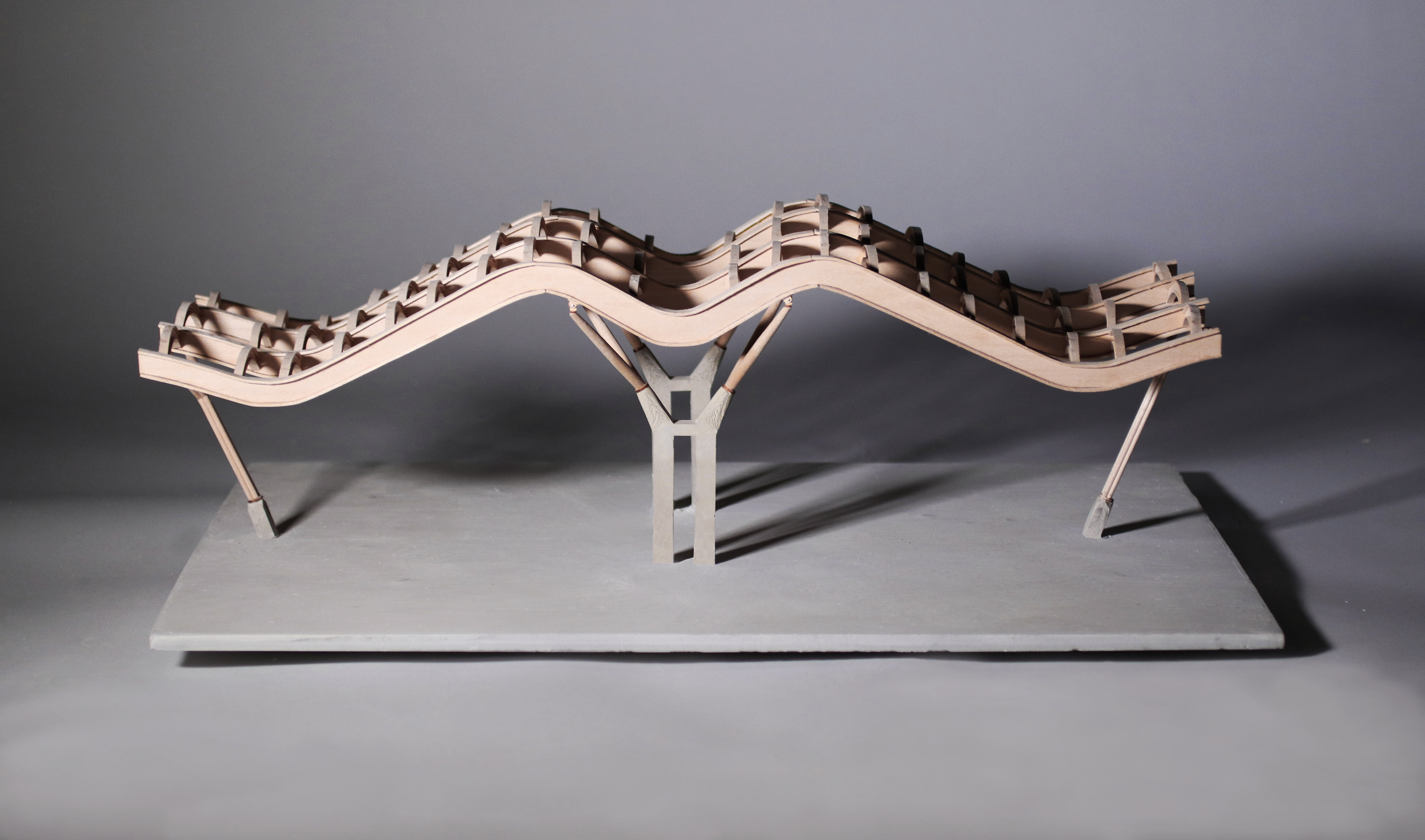 The architects wanted to create an undulating roof design that embodies the flexibility and movement of travel. The almost bird-like wings are suspended off of the floor by the steel beams. The roof ripples in both planar directions and openings are located between the steel beams to offer natural light. These intermitent skylights allow for the reduction of energy consumption and ultimately a cost reduction in maintenance. Our proposal highlights the way the roof structure sits in a sectional model that represents the core of the Madrid airport due to the extremely drawn-out and repetitive nature of the building.